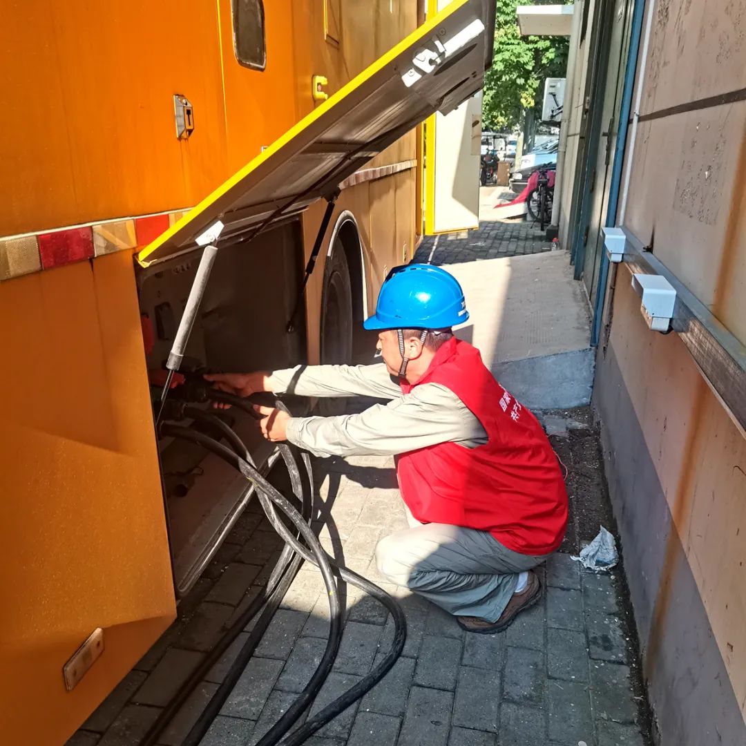 自7月23日晚11点顺利抵达目的地后,谭文国、唐海峰、杨军三位工作人员和一台400KW发电车,已经在河南省郑州市管城回族区石化路铁道凤凰家园小区连续奋战48小时,帮助郑州人民恢复生产生活秩序。