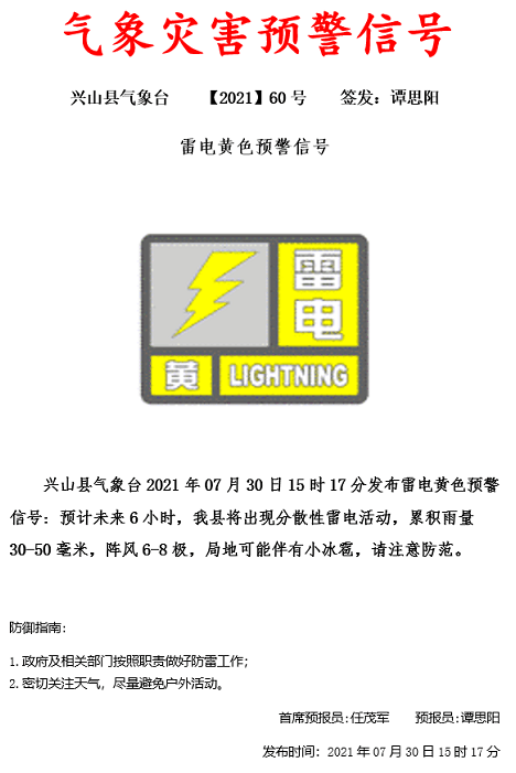 兴山县气象台发布雷电黄色预警