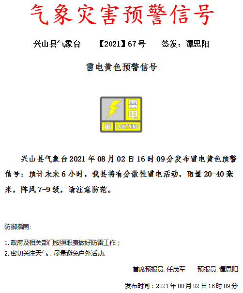 兴山县气象台发布雷电黄色预警