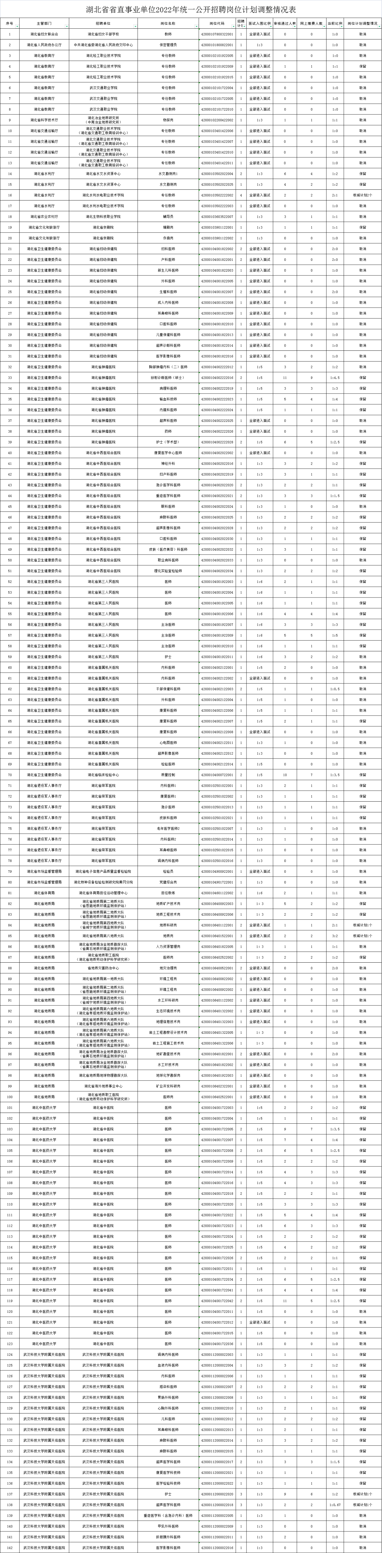 湖北省省直事业单位2022年统一公开招聘报名工作已经结束。按照《湖北省省直事业单位2022年统一公开招聘工作人员公告》关于笔试开考比例(面试入围比例)的规定,根据报名人员缴费确认情况,对于《湖北省省直事业单位2022年统一公开招聘工作人员岗位表》中未达到开考比例的岗位,经招聘单位申请、主管部门核准,现对岗位计划调整情况予以公告,具体岗位计划的保留、核减、取消情况详见附件。对被取消的岗位已缴费人员,由湖北省人事考试院通过原报名缴费渠道予以退费。