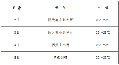 端午节假期天气预报 2022-06-01 11:53 0 根据最新气象资料分析,端午节假期期间(6月3日~5日)我县阴雨天气较多,需注意防范短时强降水、雷电、大风等强对流天气带来的不利影响,建议合理安排户外出行并携带雨具。 具体预报如下: (来源:兴山县气象局)