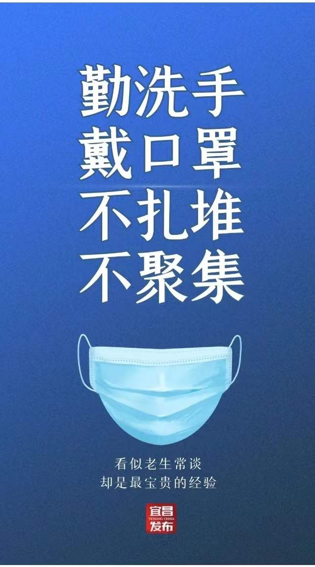最新提醒!事关疫情防控 2022-08-27 11:31 0 宜昌疾控发布8月25日疫情防控提醒 根据湖北省防指调整重点地区管控措施,为严防疫情输入,科学精准防控疫情,有效控制和降低疫情传播风险,调整部分地区来鄂返鄂人员健康管理措施。宜昌市疾控中心提醒广大市民:一、外省来(返)鄂人员主动健康申报提前通过以下任一种方式进行健康申报,并如实填报个人信息:1、登录“鄂汇办”APP——健康码—自主申报进行报备;2、登录“支付宝”APP——湖北健康码——自主申报进行报备;3、登录“微信”APP——武汉战役——健康码——来(返)汉报备系统进行报备(仅限目的地为武汉市者);4、登录自主申报网址进行报备:http://wjwsqpczdsb.chutianyun.gov.cn:16096/communityz/5、其他官方认定的自主报备途径进行报备,由各地官方负责最终解释。所有外省来(返)鄂人员入鄂后凭湖北健康码绿码通行,国内风险地区来返鄂人员需向居住地所属社区(村)、工作单位或居住宾馆(酒店)主动报备,并落实戴口罩、健康码扫码、查验行程码、核酸检测、健康管理等疫情防控措施。二、风险地区来(返)鄂人员管理有涉疫地区旅居史的来(返)鄂人员,需主动向社区、单位或酒店报备,根据出发地和途经地疫情风险等级实施分类管理:1、近7天内有高风险区旅居史的来(返)鄂人员,实施7天集中隔离医学观察,在集中隔离医学观察第1、2、3、5、7天各开展一次核酸检测。管理期限自离开风险区域算起。2、近7天内有中风险区旅居史的来(返)鄂人员,实施7天居家隔离医学观察,在居家隔离医学观察第1、4、7天各开展一次核酸检测;如不具备居家隔离医学观察条件,实施集中隔离医学观察。3、近7天内有低风险区(中高风险区所在县(市、区、旗)的其他地区)旅居史的来(返)鄂人员,抵鄂后3天内应完成两次核酸检测,并做好健康监测。4、近7天内有疫情地区旅居史人员。经评估,疫情发生地出现疫情规模较大、存在广泛社区传播、外溢风险较高的情形时,采取居家健康监测、社区健康监测及与高、中风险区相应的健康管理措施。三、请广大市民朋友接触境外和国内中高风险地区的快递、物品时,戴好口罩和一次性手套并对内外包装进行消毒,处理完后要及时洗手并更换口罩。四、接种疫苗是预防新冠病毒感染的有效方式,且对奥密克戎变异株同样具有保护效力。在没有接种禁忌的情况下,请符合条件的市民尽快接种疫苗,完成全程接种后满半年,尽快接种加强针。 各县市区疫情防控政策咨询电话一览表 再次提醒大家!做好个人防护! 戴口罩!戴口罩!戴口罩! 扩散给身边的亲友 ↓↓↓ (来源:宜昌发布)