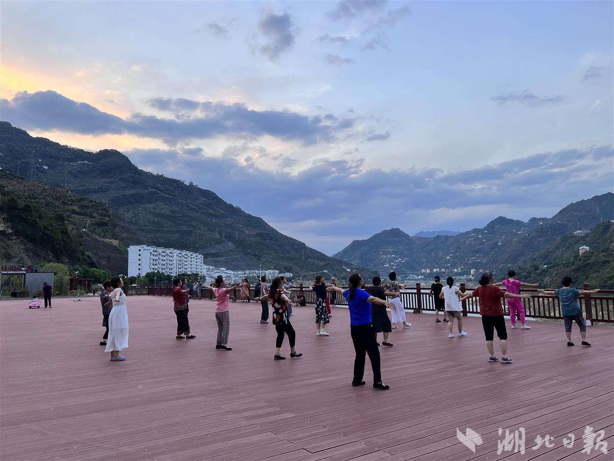 夏日傍晚,兴山县峡口镇明珠广场。居民们三两成群,沿着香溪廊道漫步,消暑纳凉。广场上,大人跳起欢快的广场舞,孩子快乐地游戏或荡秋千……