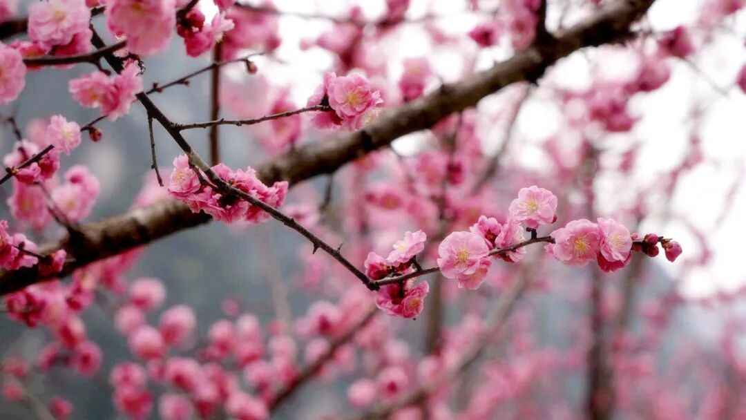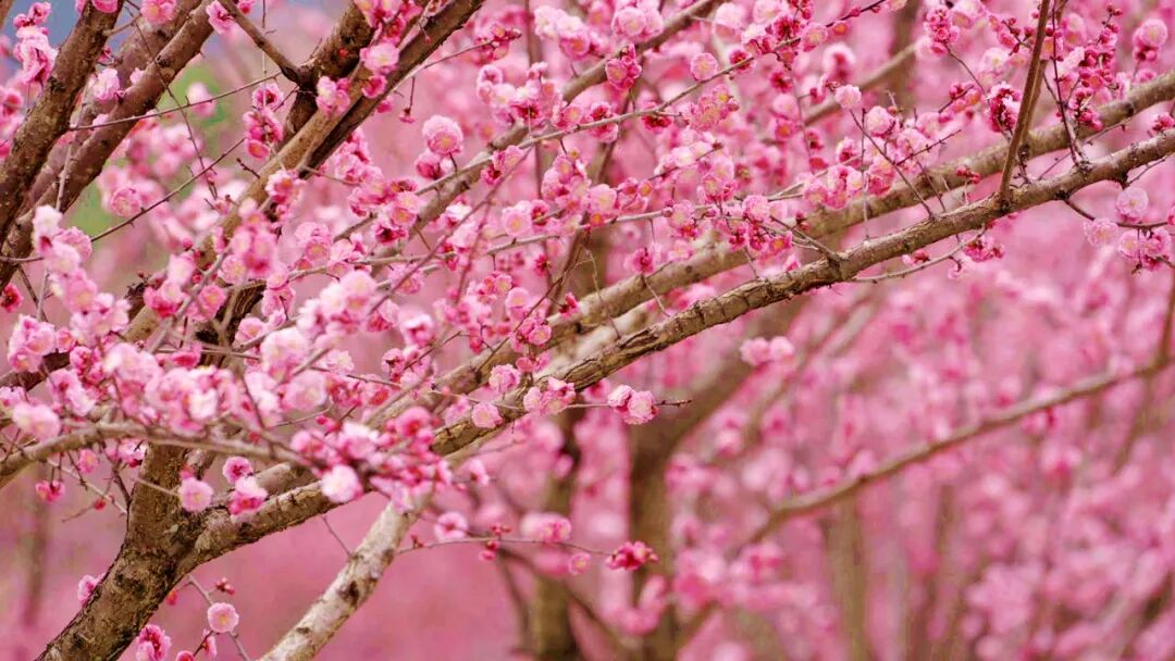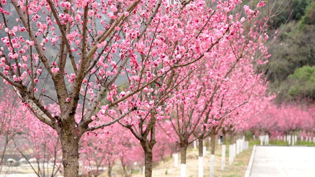 位于高岚大峡谷的1200多株梅花,沿河谷依次排开,并向山坡蔓延。