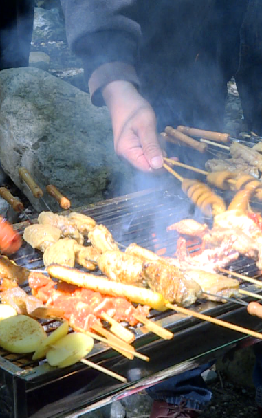 炭香滋味,火热人生。舞台前的烧烤区,烧烤桌分四列排开,一盘盘精心准备的烤串上桌,大家启动烧烤模式,肉香扑鼻。