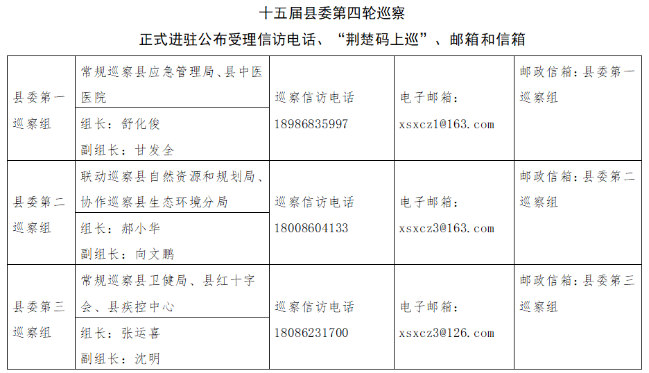 根据市委联动巡察工作要求和县委工作部署,6月中旬至8月中旬,县委巡察组对县卫健局、县应急管理局等5个单位开展常规巡察,对县自然资源和规划局开展市县联动巡察,对县生态环境分局开展市县协作巡察。6月5日至6月12日,县委3个巡察组已进驻县中医医院、县自然资源和规划局、县卫健局。巡察期间,各巡察组设置“荆楚码上巡”微信小程序、值班电话、电子邮箱和邮政信箱,在被巡察单位设立群众来访接待点。常规巡察受理反映被巡察党组织领导班子及其成员、所属单位主要负责人,以及重要岗位干部问题的来信、来电、来访,重点是关于违反政治纪律、组织纪律、廉洁纪律、群众纪律、工作纪律、生活纪律等方面的举报和反映。欢迎广大干部群众按照巡察受理范围,直接向巡察组反映有关问题,鼓励实名举报。