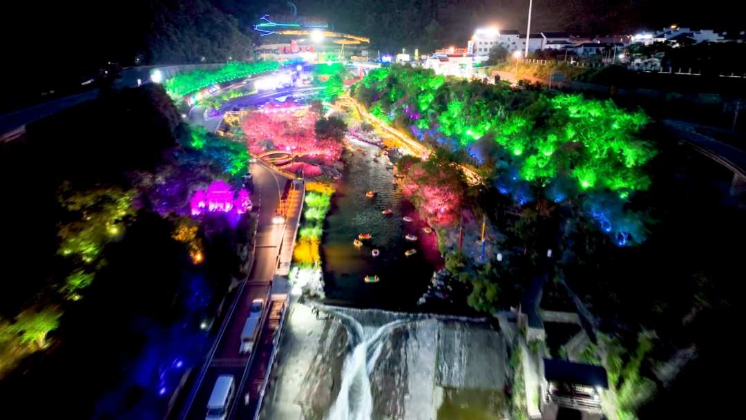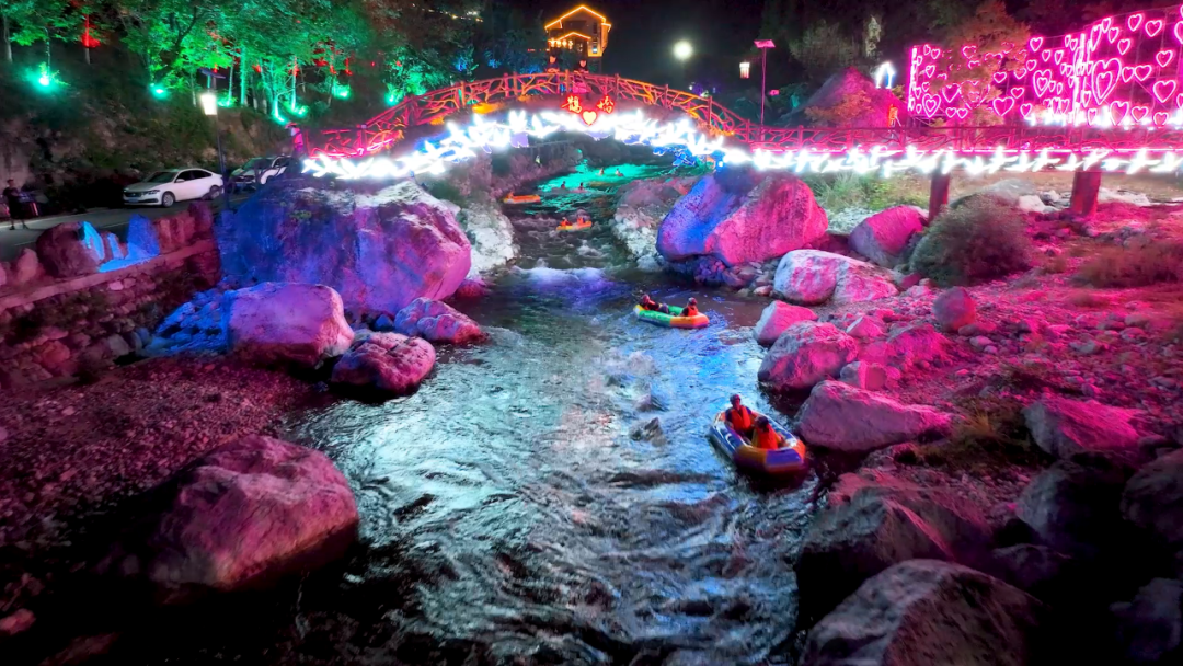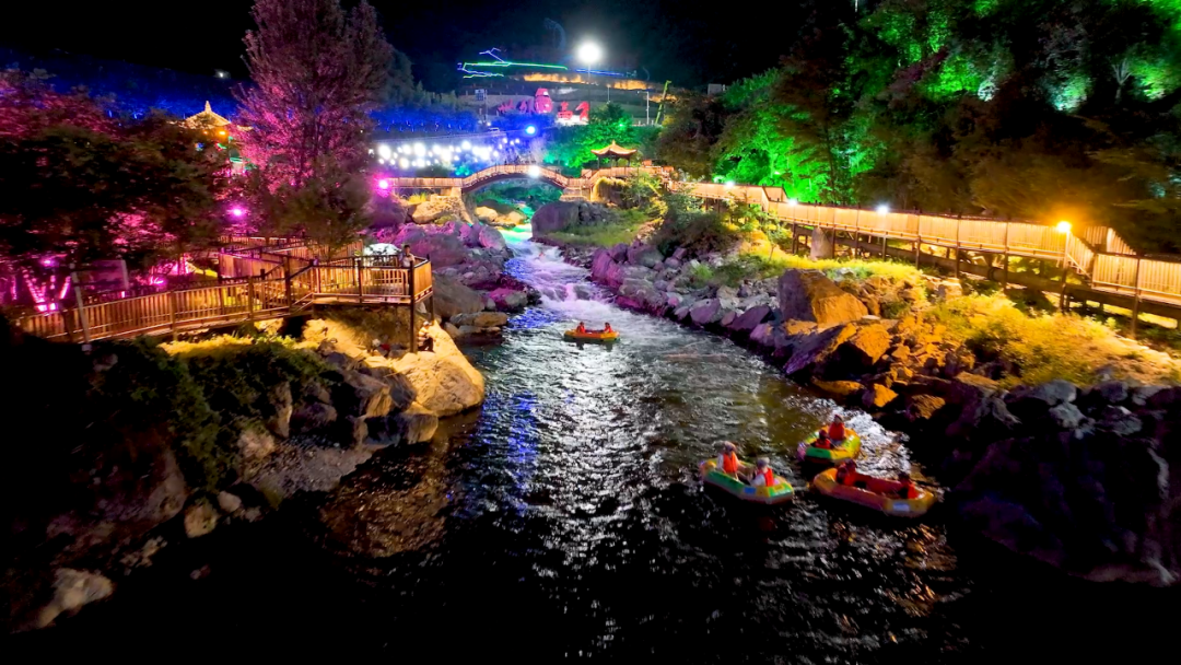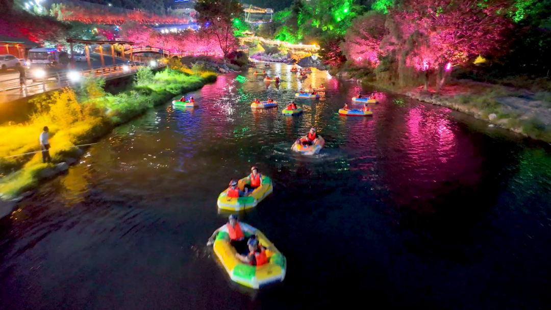浪花朵朵,灯光璀璨。在蜿蜒起伏的河道上,穿戴防护装备的游客们乘坐橡皮艇,在青山绿水间漂流消暑,炎炎夏日里,体验夏日清凉之旅。