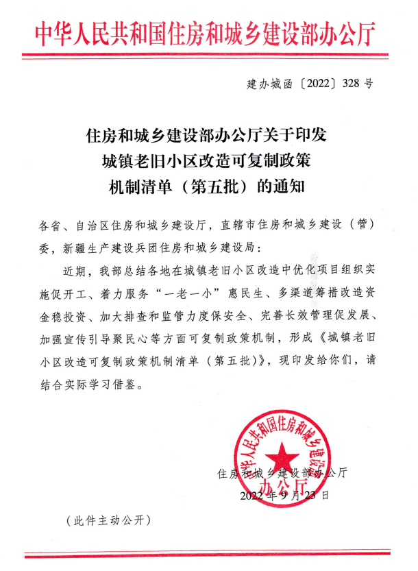 2022年9月23日,国家住房和城乡建设总结全国各地在城镇老旧小区改造中优化项目组织实施促开工、着力服务“一老一小” 惠民生、多渠道筹措改造资金稳投资、加大排查和监管力度保安全、完善长效管理促发展、加强宣传引导聚民心等方面可复制政策机制,形成了《城镇老旧小区改造可复制政策机制清单(第五批)》。