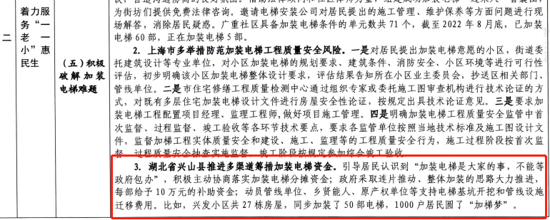 其中,兴山“推进多渠道筹措加装电梯资金”的相关经验得到关注,并在全国推广。