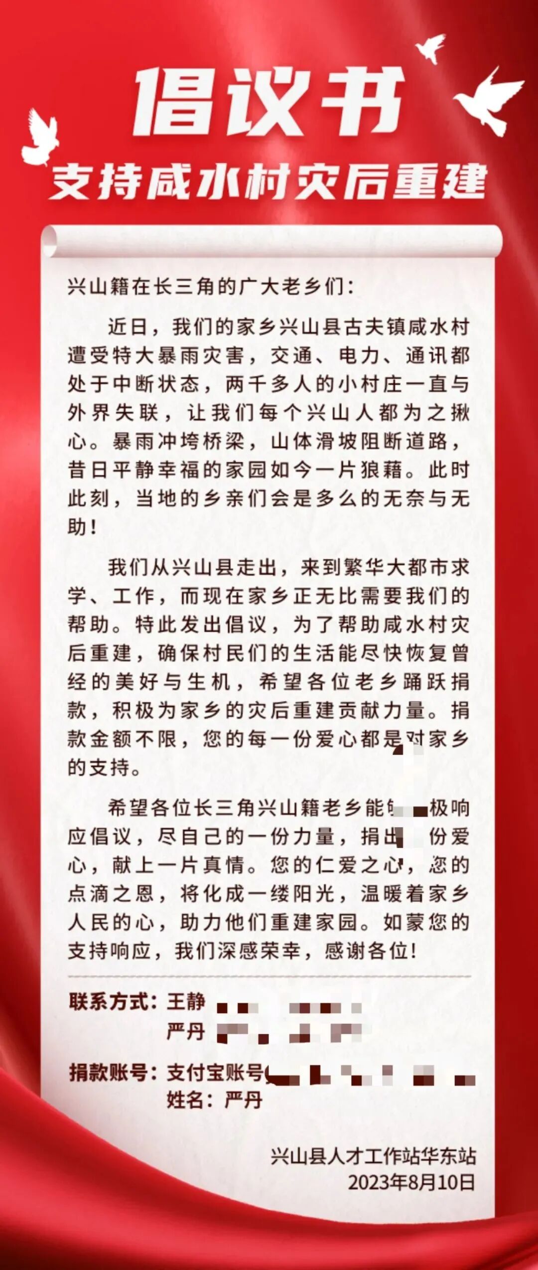 8月10日,兴山县咸水村灾后重建捐款暖心活动在县外人才工作站华东(上海)站成功举行,站长田正军、秘书长王静在“兴山籍在沪人才群”发起灾后重建倡议书,号召106名兴山籍在沪人才踊跃捐款。