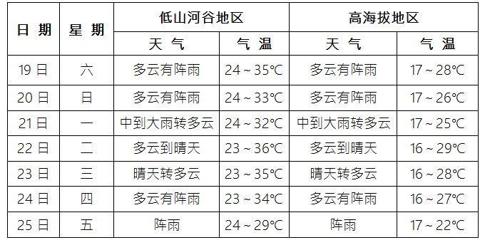 未来一周(8月19日~25日)我县多阵性降水,局部伴有短时强降水、雷电大风等强对流天气,高温天气有所缓和。具体预报如下: