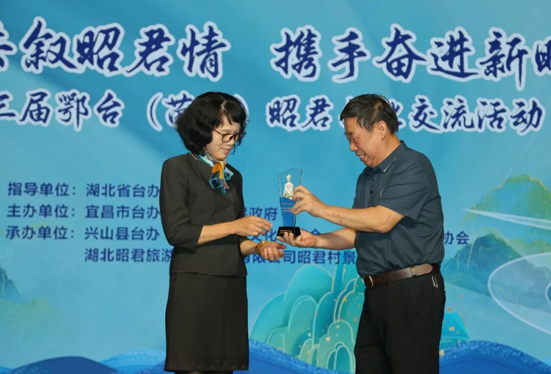 活动现场,还为台湾苗栗县昭君文化协会舞蹈队颁发“昭君颂”广场舞奖杯,两地互赠书法作品和锦旗,厚植“两岸一家亲”的浓浓情谊。