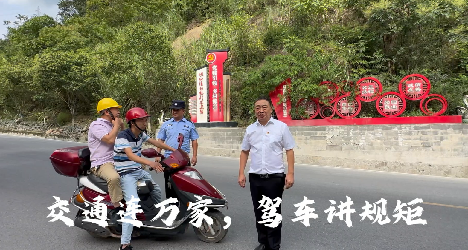跟随拍摄小分队的步伐,我们来到了党群活动中心门口,治调委员郑红军身穿制服,正在对没有戴头盔驾驶的村民进行拦截教导,拍摄小分队立刻架起手机,书记走到镜头前,随即唱出“交通连万家,驾驶讲规矩”。