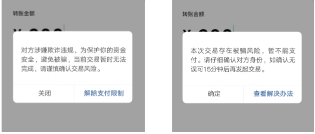 ➤第二种情况,是在转账付款过程中,弹出提示框显示“对方涉嫌欺诈违规,为保证你的资金安全,避免被骗,当前交易暂时无法进行,请谨慎确认交易风险”。