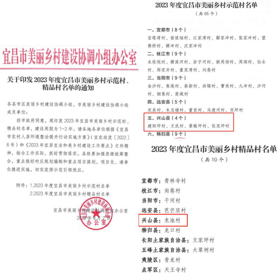 近日,宜昌市美丽乡村建设协调小组办公室印发2023年宜昌市美丽乡村示范村、精品村名单,我县建阳坪村、文武村、黄粮坪村、伍家坪村获评2023年度宜昌市美丽乡村示范村!龙池村获评2023年度宜昌市美丽乡村精品村!