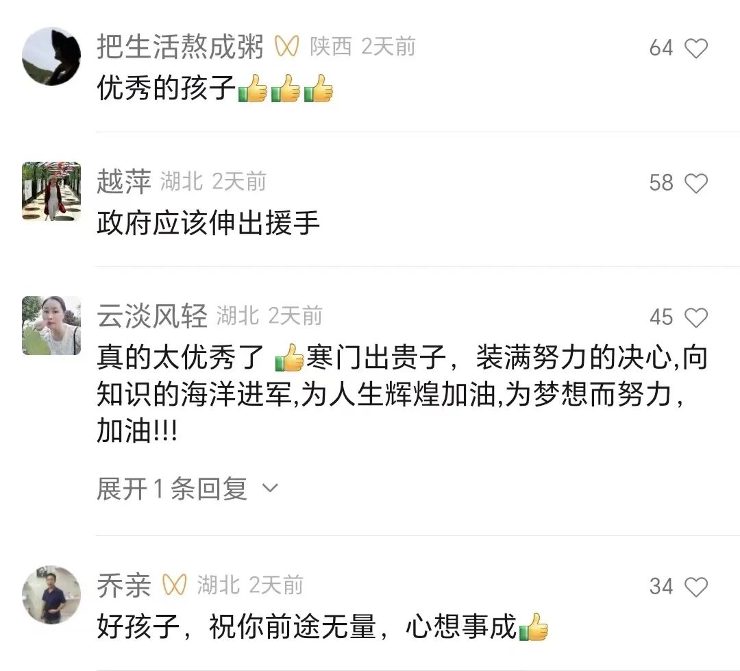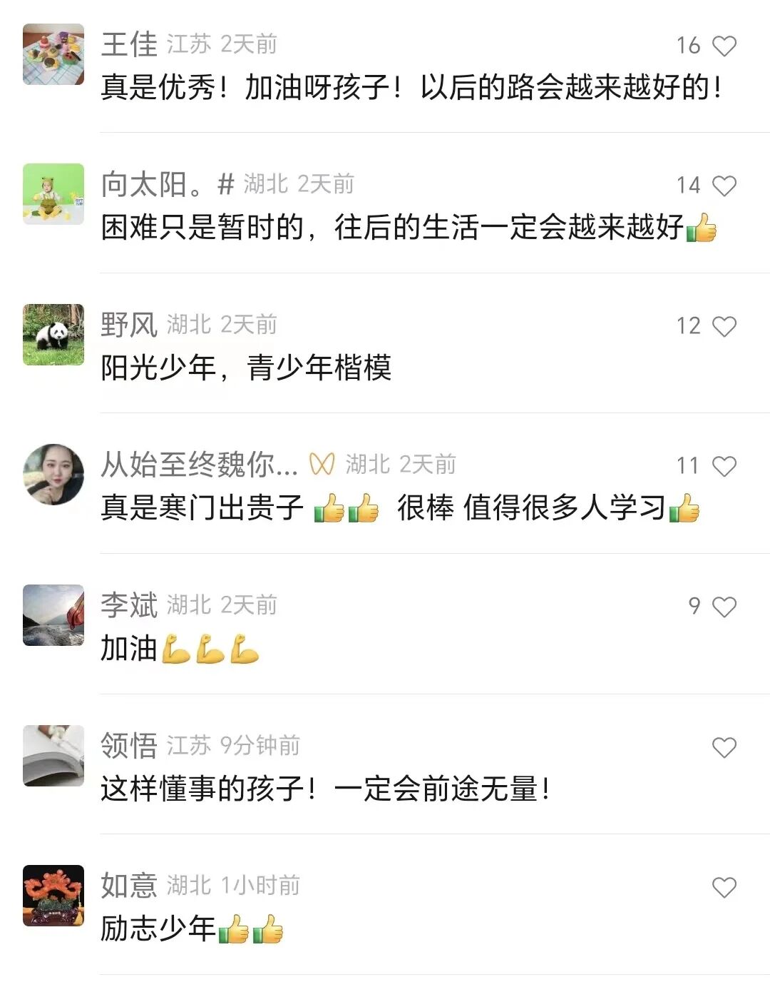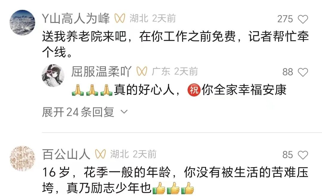 有网友留言:“送我养老院来吧,在你工作之前免费供养,记者帮忙牵个线。”有网友留言,希望捐款帮助父子二人。评论区里,爱心如潮,众多网友表示,愿伸出援手帮助这个困难家庭的孩子。还有很多网友对“孝义少年”给予精神上的鼓励。