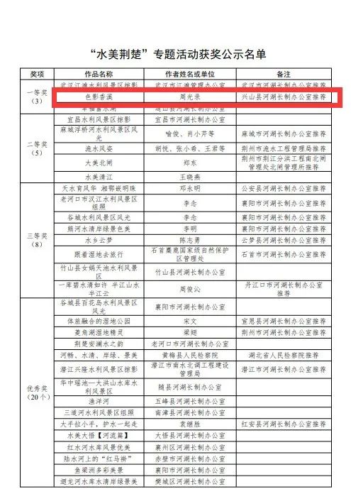 9月8日,湖北省河湖长制办公室公布“守护幸福河湖 共享水美荆楚”短视频征集活动获奖名单,兴山县河湖长制办公室选报作品《色影香溪》《夫妻河长》从全省近500件作品中脱颖而出,分别喜获省一、三等奖。
