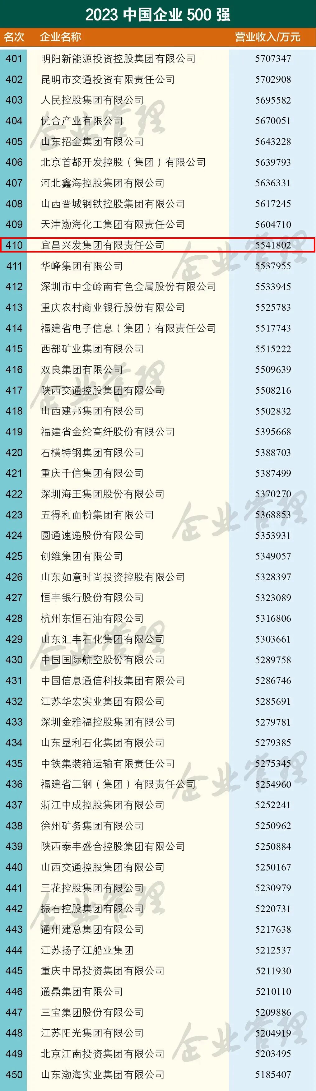 会上,中国企业联合会、中国企业家协会连续第22次发布中国企业500强榜单,同时发布中国制造业企业500强、中国服务业企业500强、中国跨国公司100大及跨国指数、中国战略性新兴产业领军企业100强、中国大企业创新100强等各项榜单。兴发集团位列中国企业500强第410位。