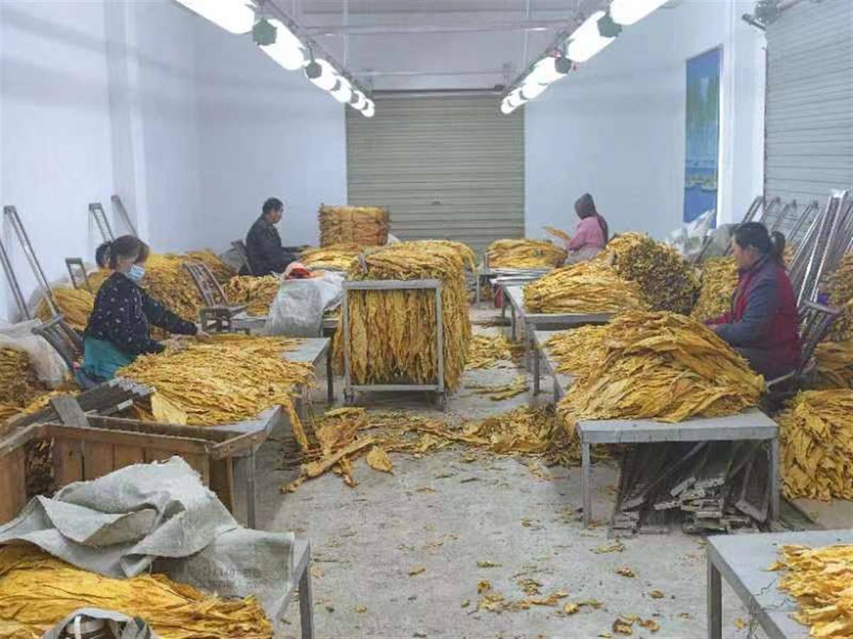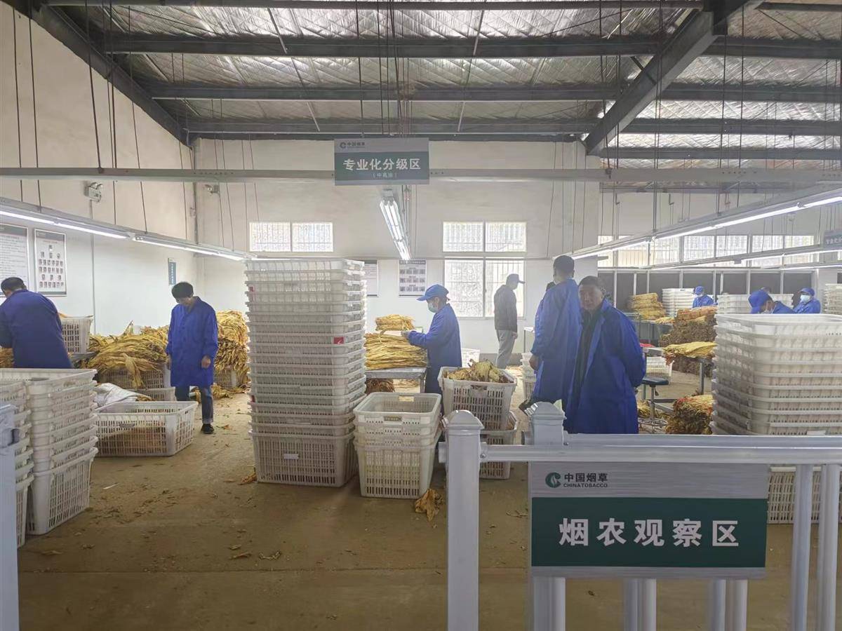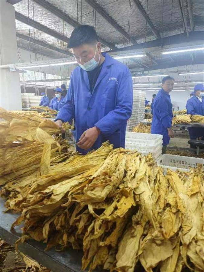 分级车间供烟农自行质检、分级。“烟叶评定有42级,每级收购价都不一样。好的烟叶是金黄色,避免斑点,摸起来有油脂的感觉。”正忙着自行定级的村民赵永根一边观察烟叶、一边向记者介绍自己的经验。他家今年承包了30亩地种烤烟,预计每亩地收入6000多元。