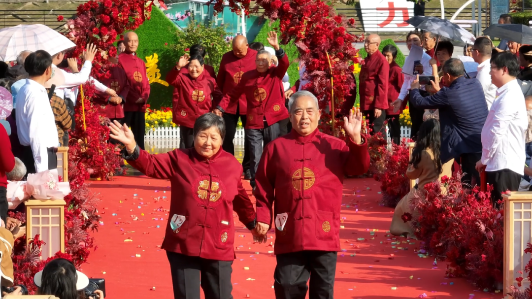 在热烈欢快的唢呐声中,64对金婚夫妇身着礼服,手牵手走上红毯,共赴一场浪漫的集体婚礼。结婚65年的陈大贵、文道枝夫妇,在四个女儿的见证下高兴地参与其中。