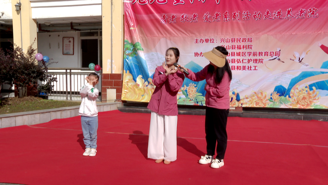 当天上午10点,兴山县福利院内的小广场上聚满了人。老人们兴致勃勃地接受了幼儿园小朋友的集体问候,欣赏了孩子们带来的《花木兰》《快乐的小猪》等幼儿操,老师们则带来了歌曲和独舞。孩子们还在现场与老人们展开了互动,大家一起唱起了“挖呀挖”歌曲。