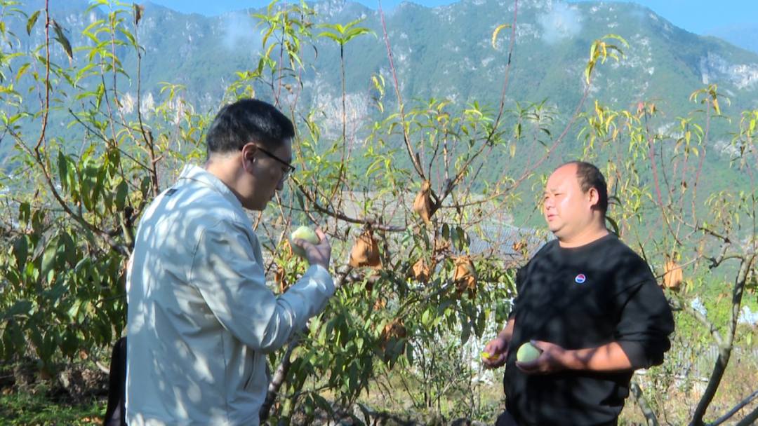 当天上午,在忙完手头的工作后,袁剑赶到了30多公里外的峡口镇岩岭村,来到残疾人唐朝国的家中。几年前,唐朝国因在煤矿打工时发生意外致残,回到家后,他也开始种起了冬雪桃。