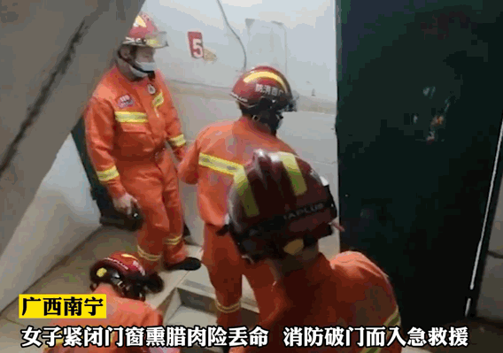 03 2023年1月,广西南宁,女子门窗紧闭在家中熏腊肉备年货,导致一氧化碳中毒。消防救援人员赶赴破开房门,只见女子浑身无力无法动弹,客厅里放着用晾衣架搭制的简易熏肉架。