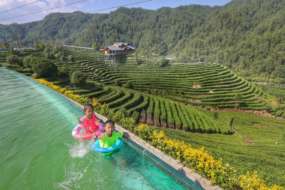 2023年8月17日,湖北省兴山县水月寺镇“水月时光”民宿,双胞胎兄妹在海拔800多米的茶山泳池里玩耍。水月寺是兴山著名的茶区,去年引进企业在茶山建成民宿。今年入夏后月均接待游客7000多人,较去年增长一倍多,该镇生态产业又添一网红打卡点。