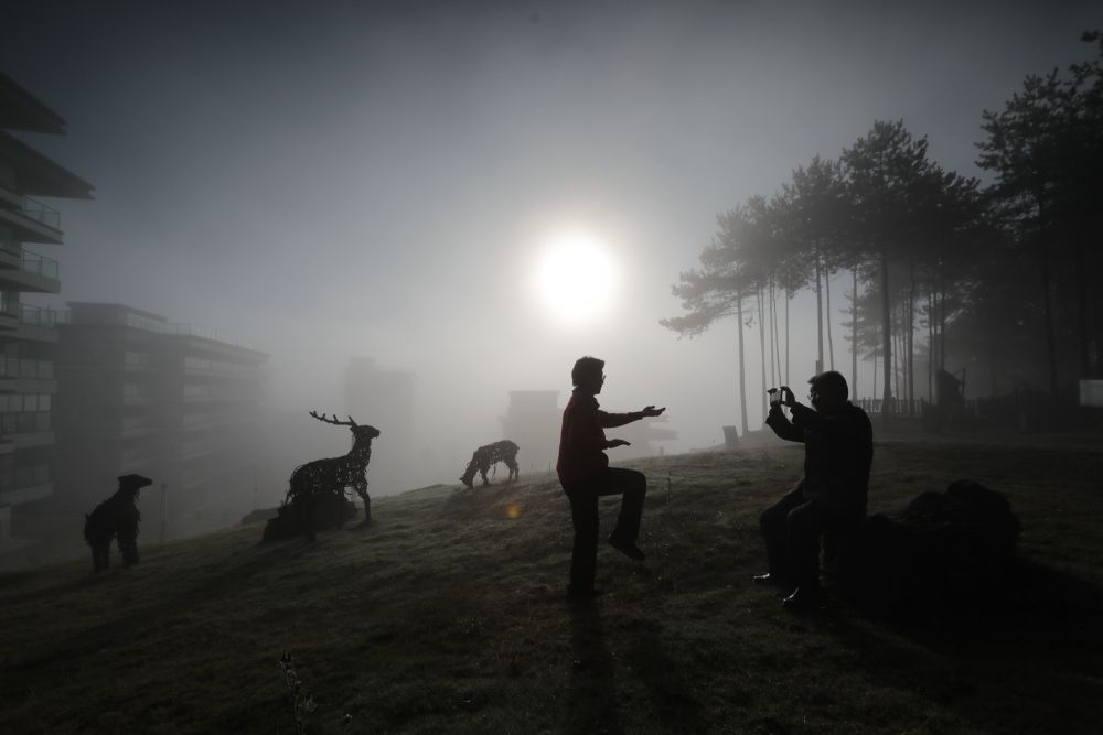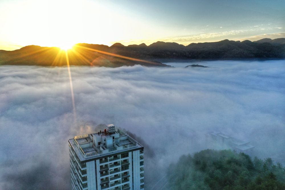 2022年10月11日,湖北省兴山县榛子乡。“昭君原野”新居民在海拔1300多米的楼顶迎接云海上的第一缕阳光。