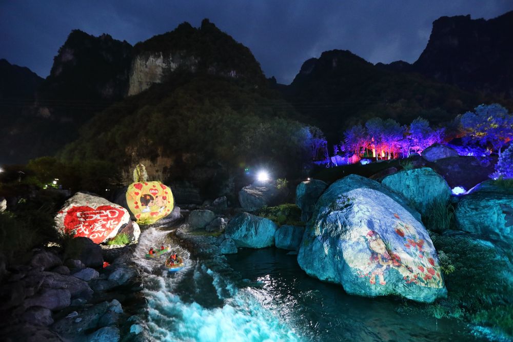 2023年8月18日,湖北省兴山县朝天吼漂流景区。游客们在夜色中漂流。在全国率先推出的“夜漂”有效增加了漂流市场新供给,也为文旅消费注入新动能。