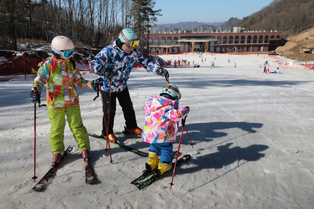 2023年1月7日,湖北省兴山县三峡云栖谷国际滑雪场,宝妈李红芹(前左)、宝爸魏云虎(后左一)带着4岁的儿子魏家瑞(后左二)学滑雪。