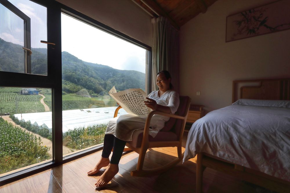 2023年8月9日,湖北省兴山县榛子乡板庙村四组。“老院子”民宿负责人王江霞在大大的玻璃窗前研究毛笔字。她新冠疫情时开始改造收购的老房子,现有20张床位,其风格和服务很受城市游客青睐。