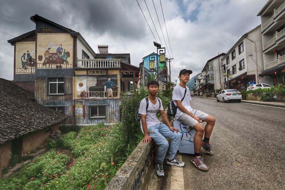2023年8月9日,湖北省兴山县榛子乡板庙村。保康县歇马镇间桃村高二学生蒋朋(右)和同村高三学生蒋超(左)在板庙村游玩后等车去神农架。该乡投资500万元,对板庙村集镇、蚂蝗冲和白龙潭景区共计38户民居进行改造,再现了板庙老街的文化风采。