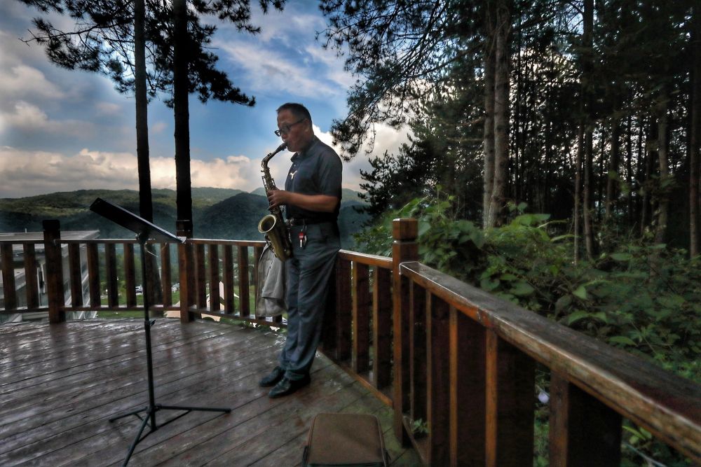 2023年8月9日,湖北省兴山县榛子乡昭君原野。一位武汉业主利用避暑学习萨克斯。
