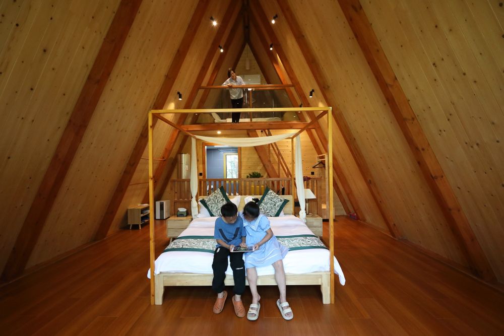 2023年8月17日,湖北省兴山县水月寺镇“水月时光”民宿。一位年轻妈妈带着孩子度假避暑。