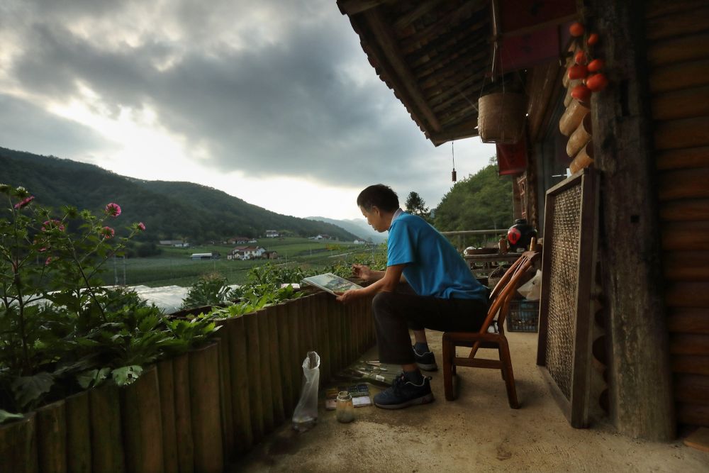 2023年8月9日,湖北省兴山县榛子乡板庙村。十堰市车城高中退休美术老师吴正庆在“老院子”民宿写生。他和该市两位画家朋友被两位摄影家带到这里,凉爽的气候、美丽的乡村让他画个不停。
