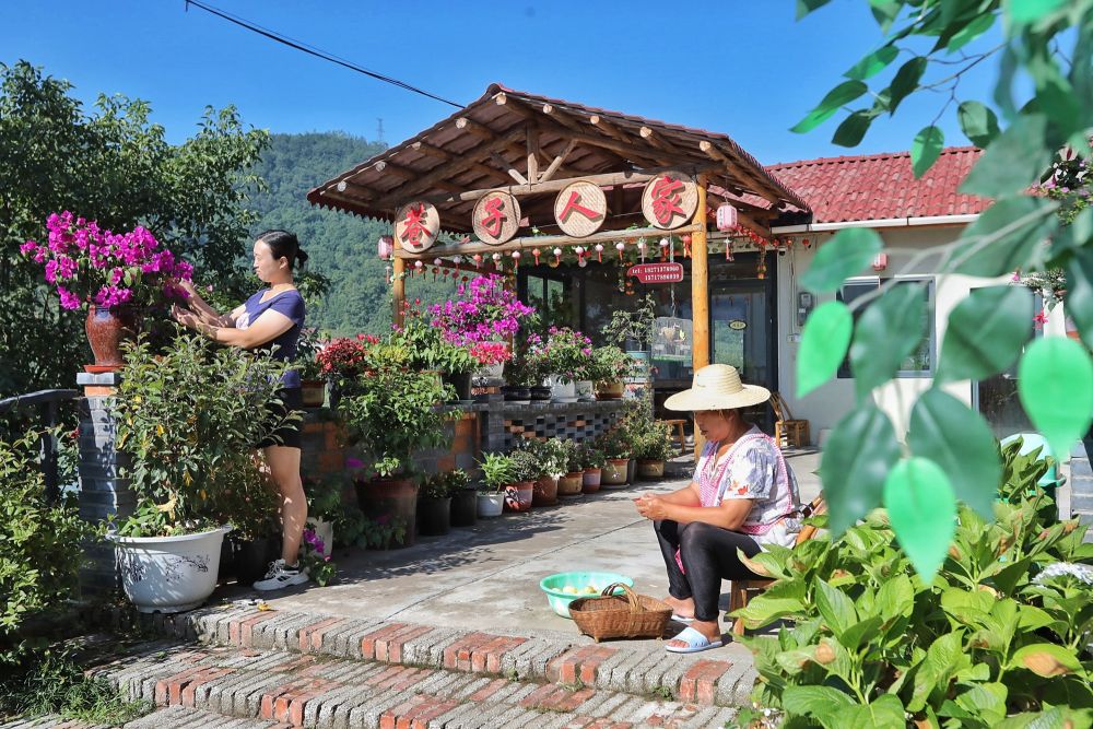 2023年8月9日,湖北省兴山县榛子乡和平村一组。“巷子人家”农家乐女主人翟金蓉(左)每天清晨都要整理院子里的花草。翟金蓉的爱人因“六尺巷”的故事,为发扬父辈的传统,2019年开办农家乐时取名为“巷子人家”。如今,“巷子人家”深受游客喜爱。
