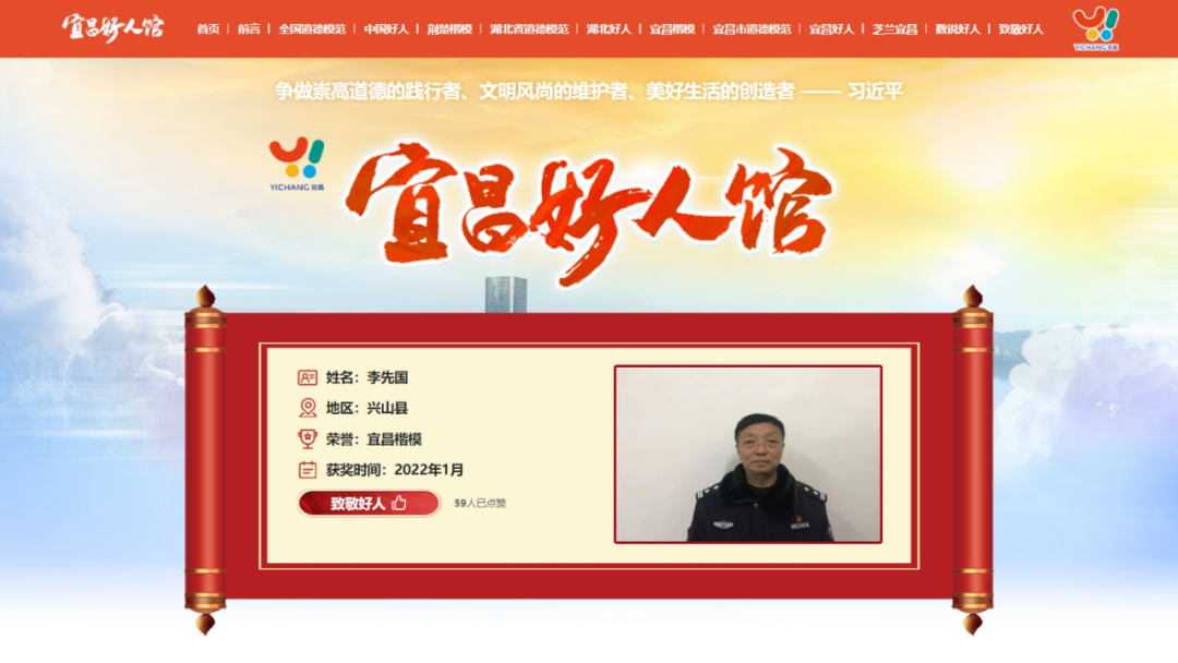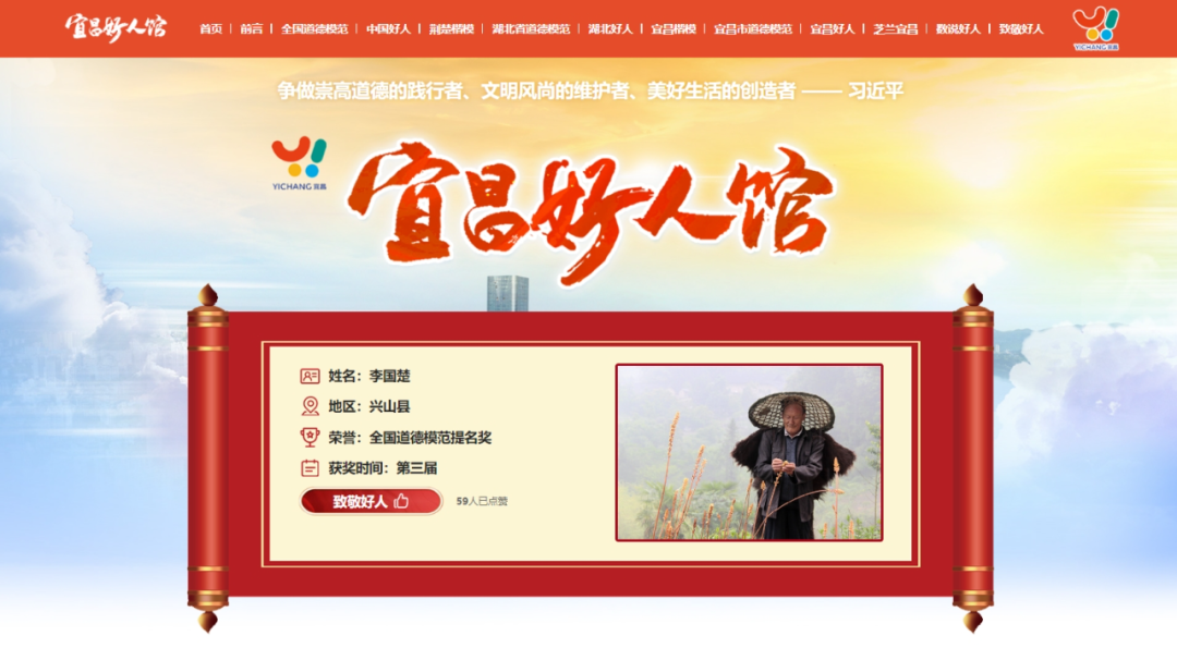 自2021年宜昌市建成全省首个好人馆之后,为积极适应互联网时代的需求,市委宣传部、市委文明办打造了宜昌好人馆数字馆。数字馆采用文字、图片、视频、互动等多种形式,直观、形象地展示各类先进典型的感人事迹和亮丽风采,生动诠释新时代好人精神和道德风范,让“宜昌好人”的故事随时随地可看可听可学。