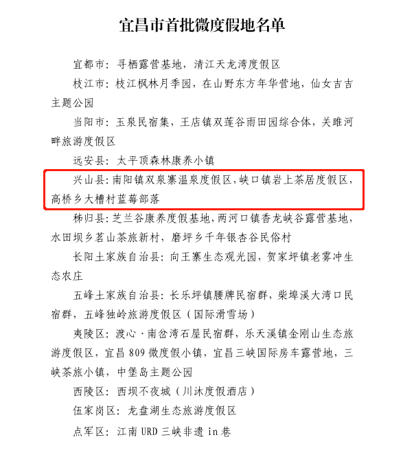 近日,宜昌市文化和旅游局发布《关于公布宜昌市首批微度假地的通知》,兴山县南阳镇双泉寨温泉度假区、峡口镇岩上茶居度假区、高桥乡大槽村蓝莓部落获评宜昌市首批微度假地!