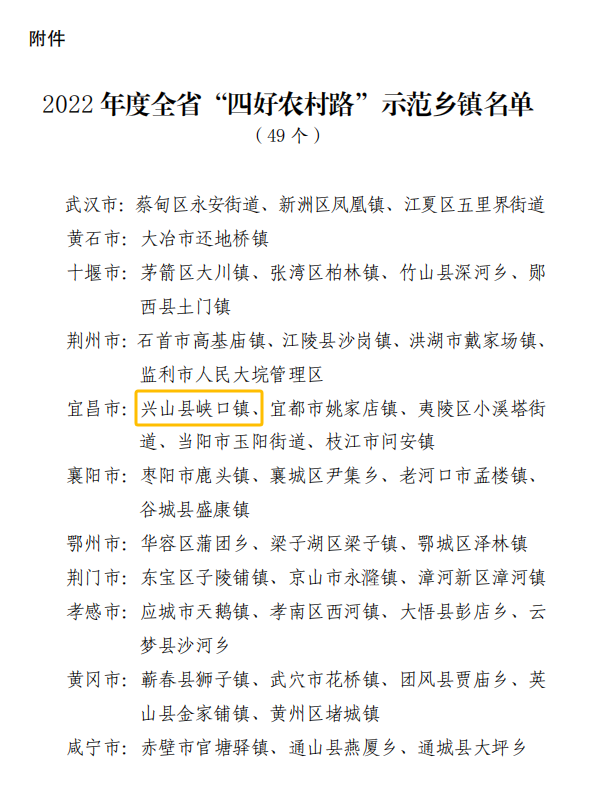近日,湖北省交通运输厅发布《关于命名2022年度全省“四好农村路”示范乡镇的通知》兴山县峡口镇上榜获得农村公路建养资金200万元!