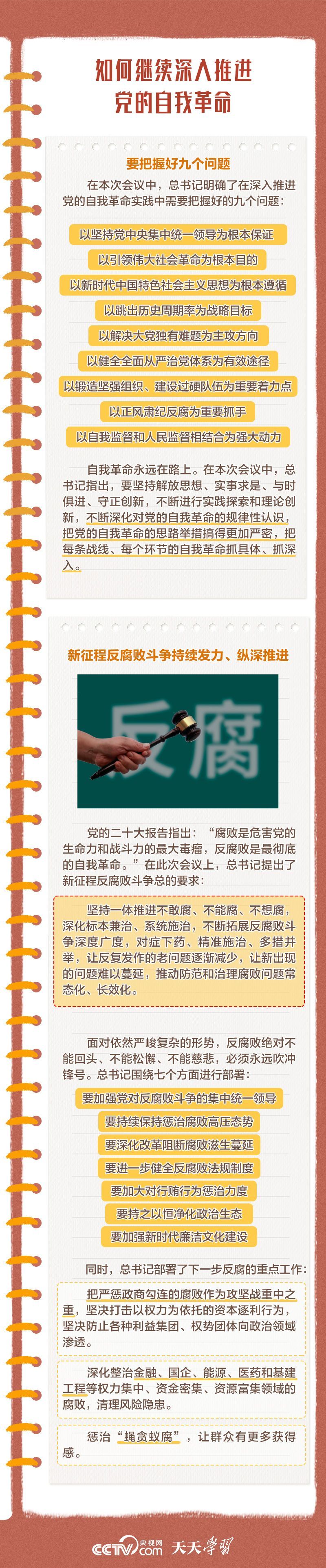 勇于自我革命是我们党最鲜明的品格和最大的优势,总书记多次对推进党的自我革命作出重要部署。此次会议上,总书记深刻阐述了党的自我革命的重要思想,明确提出需要把握好九个问题,并对持续发力、纵深推进反腐败斗争作出战略部署。央视网《天天学习》与您一起学习。