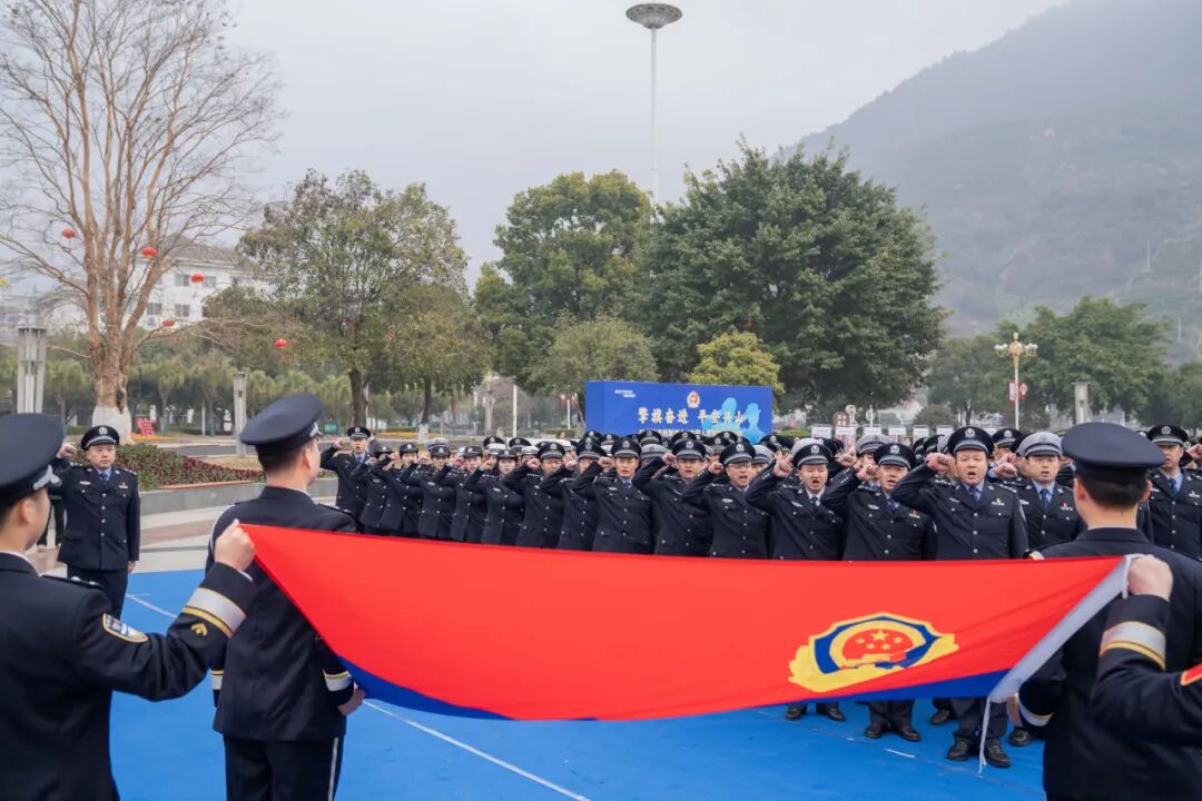 活动在庄严的警歌声中拉开序幕,四名民警手擎警旗,参加仪式的全体人员立正站立,向中国人民警察警旗庄重敬礼,齐声高唱中国人民警察警歌,重温公安机关人民警察誓词。