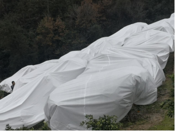 茶园行间铺草可以有效提高地表温度1-2℃,减轻冻害影响。铺草的厚度要达到10cm;树冠覆盖可以起到防风、保温效果。可选杂草或树枝,也可以用塑料薄膜或遮阳网进行覆盖,可以有效提高夜间0.3-2℃的温度。