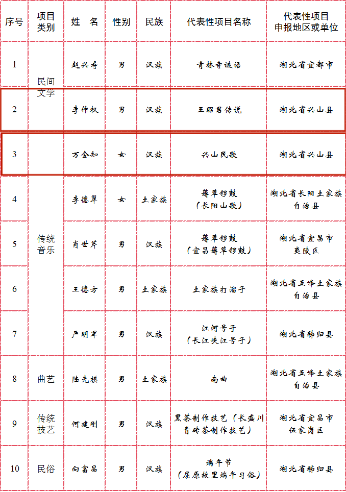 2月19日,文化和旅游部公示了第六批国家级非物质文化遗产代表性传承人推荐人选名单,全国共958人,湖北省40名传承人榜上有名,兴山县入选两人。
