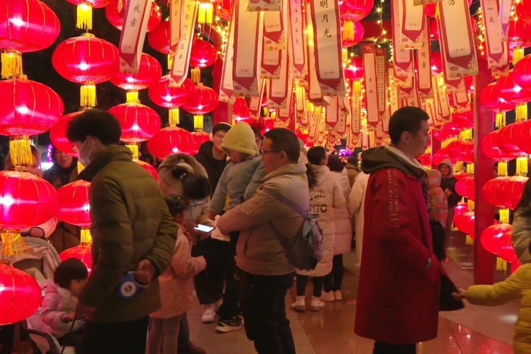 灯谜区现场,一排排红灯笼烘托着节日的红火氛围,一张张写有灯谜的纸条随风飘动,市民群众或冥思苦想,或共同探讨,大家尽情体验猜谜的乐趣。