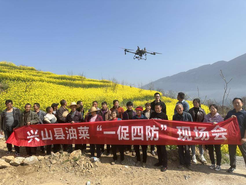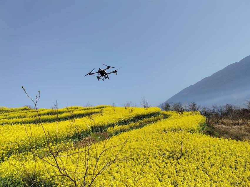 春分已至,万物生长。在峡口镇竹溪村,成片的油菜花开得正艳,踏着春色在田间忙碌的村民们,一时纷纷放下手中的农活,望着油菜花上空的“小飞机”来回忙碌着。