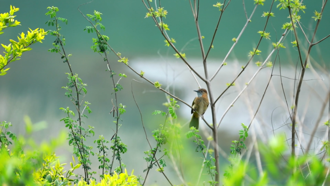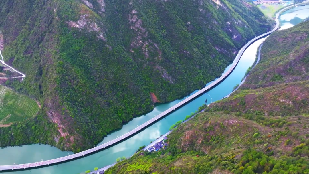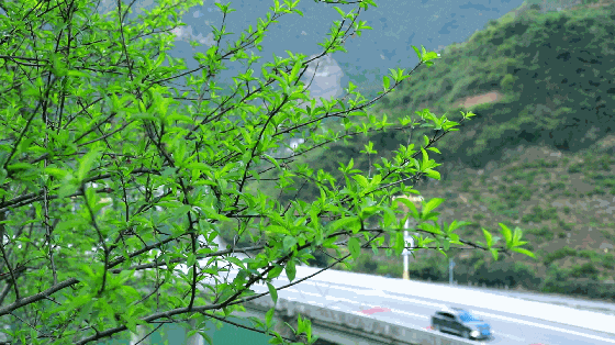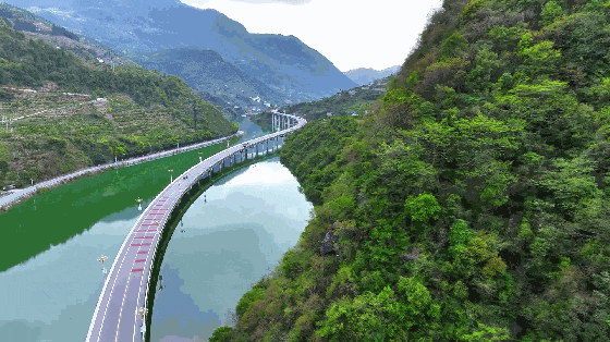 漫山绿叶凝碧流翠,河畔鸟语花香,碧绿的溪水、如梭的车流和蜿蜒曲折的“水上公路”构成一幅“路景相融”的生态画卷。