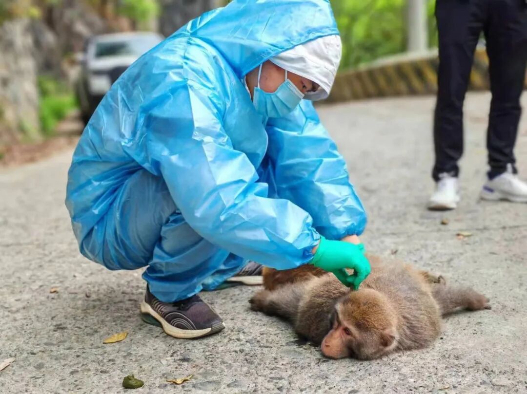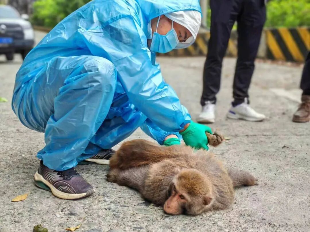 4月22日早上7点,万朝山保护区辖区村民在龙门河村村级公路上发现一只猴子趴在地上一动不动,热心村民担心其安危,立即向万朝山保护区报告。随后,万朝山保护区迅速联系县林业局森防站以及南阳镇畜牧服务中心赶往现场。