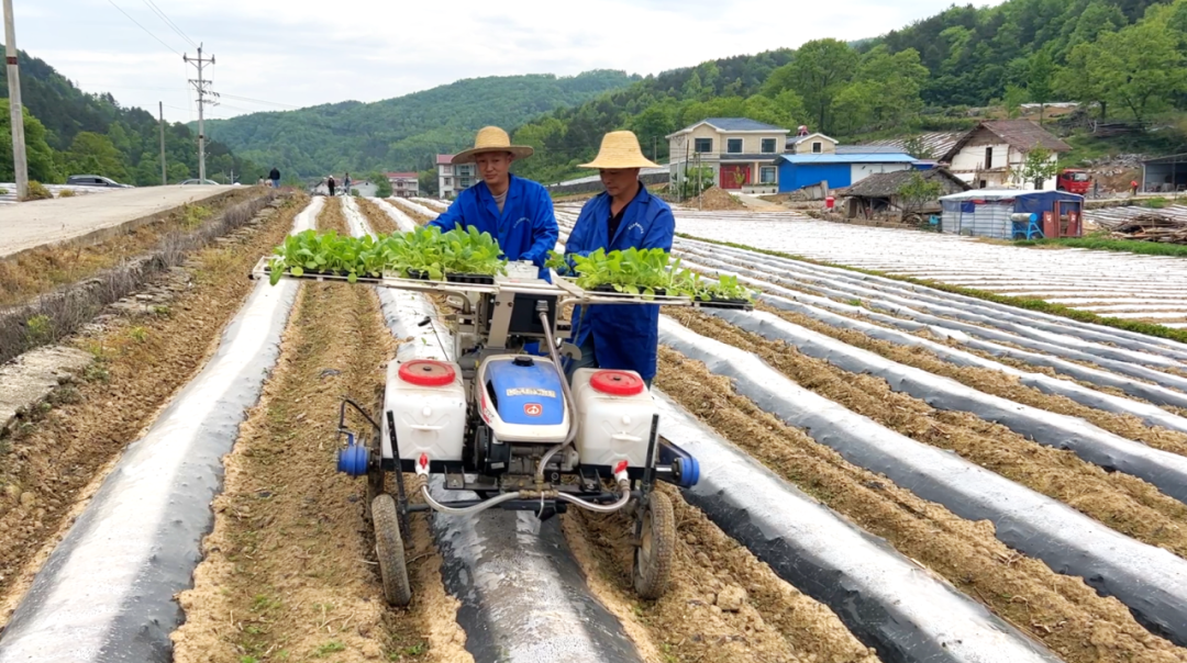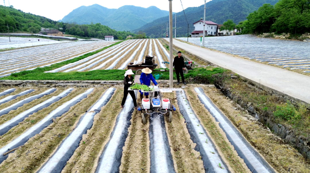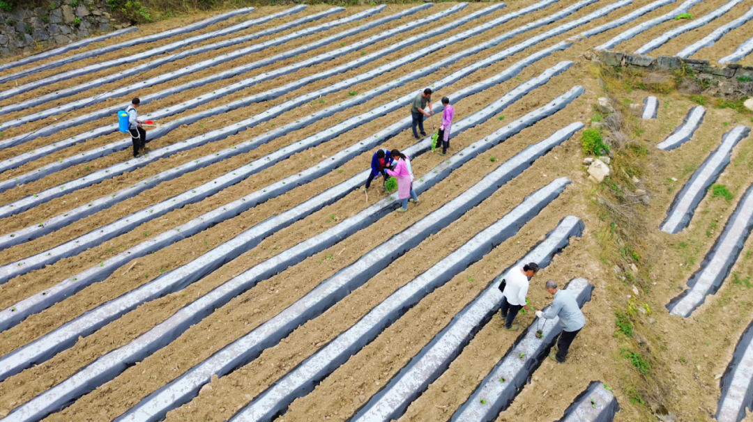 在离育苗大棚不远处的板庙村,一垄垄烟田整齐排列在山间,白色地膜铺满田间地头,烟农们手握工具,一开一合一步一挪,一株株烟苗便在田垄间挺立,承载着烟农们丰收愿景,生机勃勃。