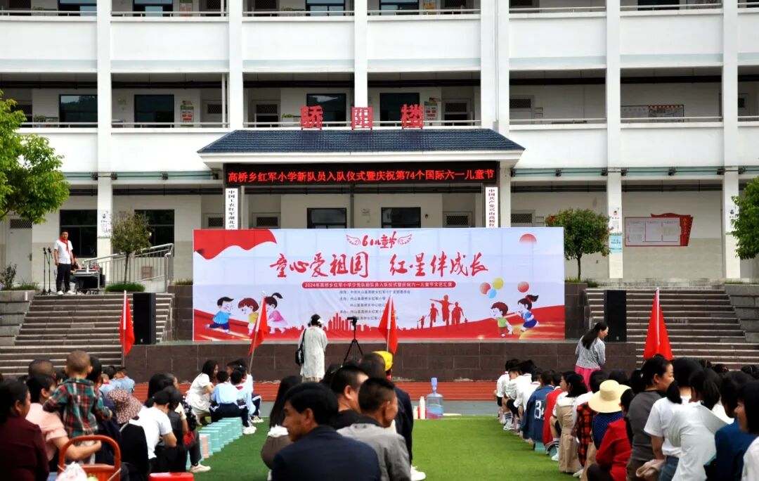 5月31日,高桥乡红军小学、高桥乡中心幼儿园联合举行以“童心爱祖国 红星伴成长”为主题的“六一”儿童节庆祝大会。孩子们用自编的舞蹈、诵读、手势操等方式展现出自信、童真和可爱,以深情的演出抒发着对党和祖国的忠诚与热爱。